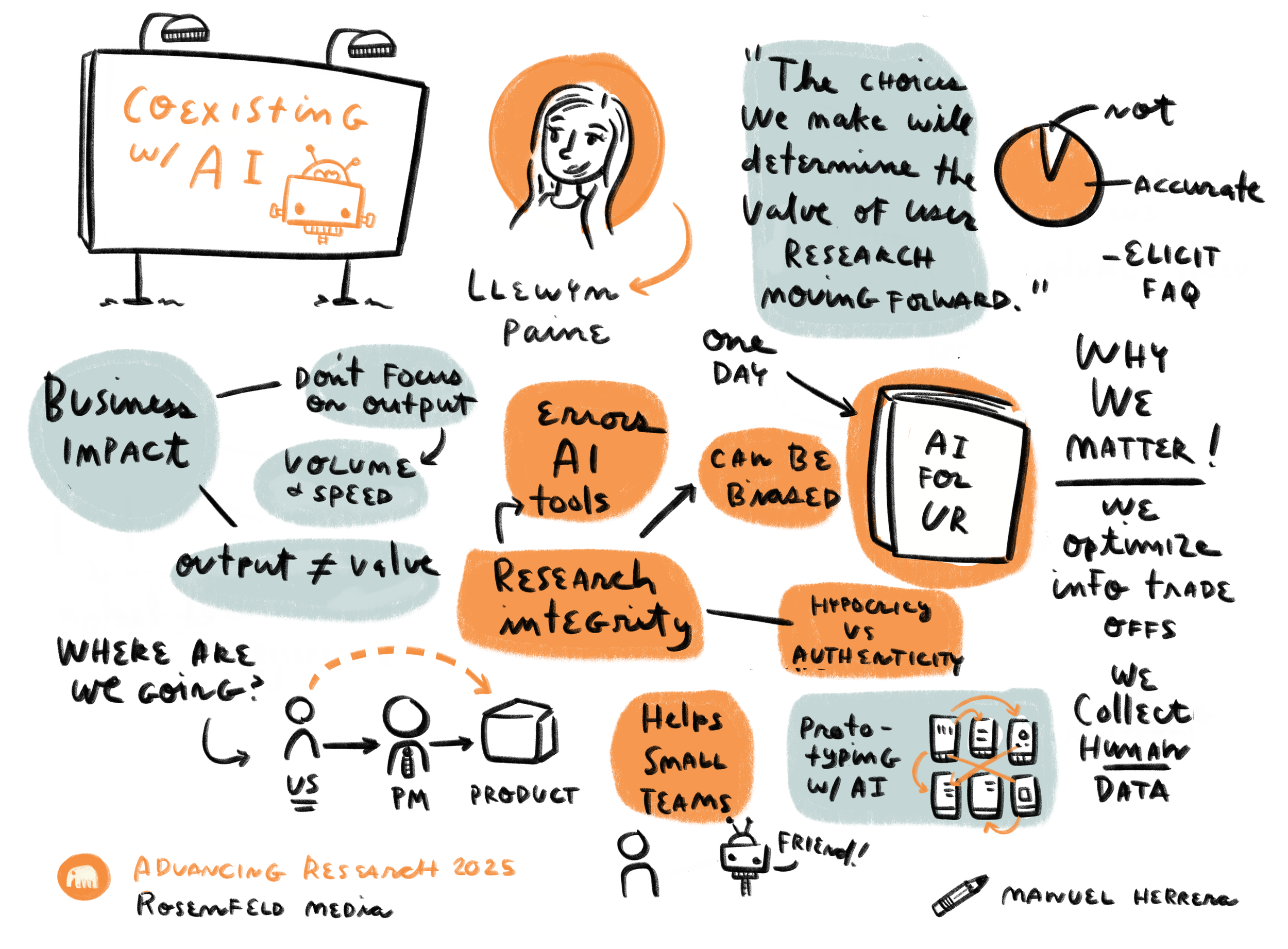 Sketchnotes from Rosenfeld Media Advancing Research 2025 (by Manuel Herrera)