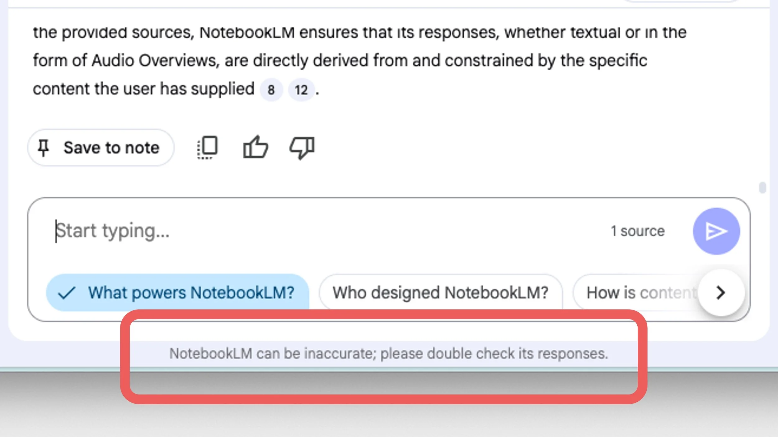 And these problems are evident in NoteboookLM’s user reviews when you start to dig into them–there are reports of it misquoting sources and leaving out critical information, just like we’d expect based on its underlying technical architecture. And just like every other major LLM, it has a disclaimer in the footer: “NotebookLM can be inaccurate; please double check its responses.”