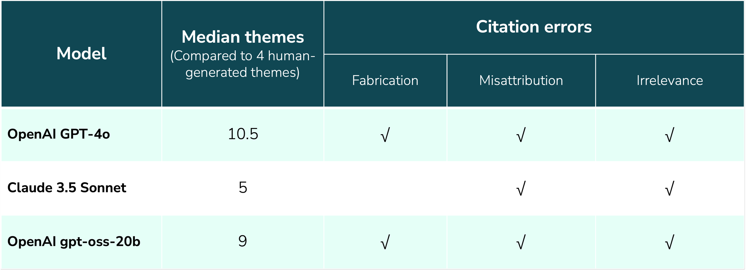 Since ChatGPT’s debut in 2022, researchers and non-researchers alike have been attempting to adapt them as a rapid solution for qualitative analysis. Early evaluations of LLM effectiveness for this task have been informal and lacking in rigor, leaving questions about whether or not LLMs are up to the task. In this report, we introduce a more rigorous method for evaluating LLM analysis across multiple runs of the exact same prompt and dataset. In early 2025, we tested two of the most popular LLMs for research (GPT-4o and Claude 3.5 Sonnet), as well as gpt-oss-20b, and found that while they do produce plausible-looking themes, all three introduced serious errors, including quote fabrication and misattribution.